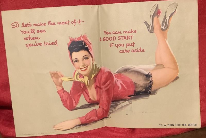 Wartime Pin up Poster by Famous Artist Knute O Munson. Well know for his Paintings of Ladies. Lovely condition. Poster to front has lady posing, with more ladies to the rear. Size 25 x 16 Inches. This folds down to booklet size.