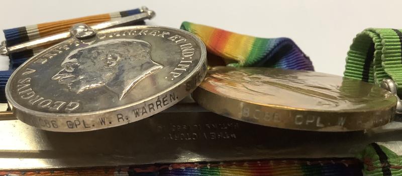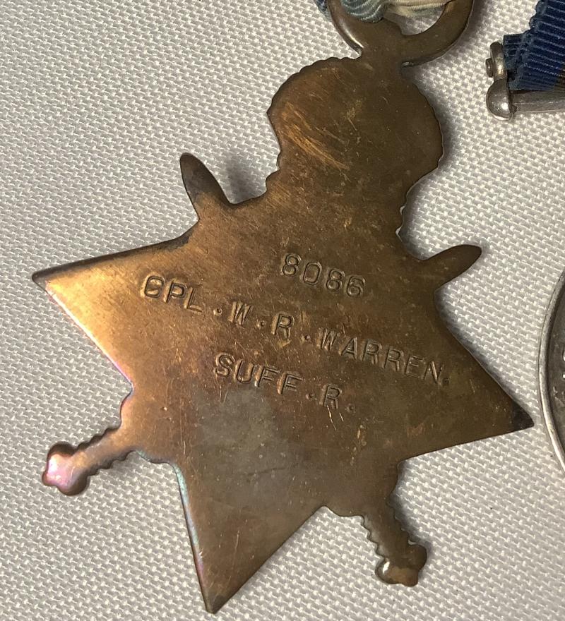 1915 Star Trio named to 8086 CPL W R Warren from Suffolk Regiment, together with WWII Defence Medal.