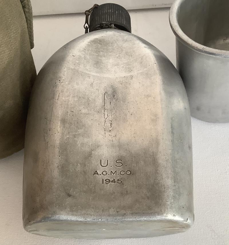1945 Dated Water Bottle, Cup, Cover. Minor dinks in bottle due to storage, overall good original condition.