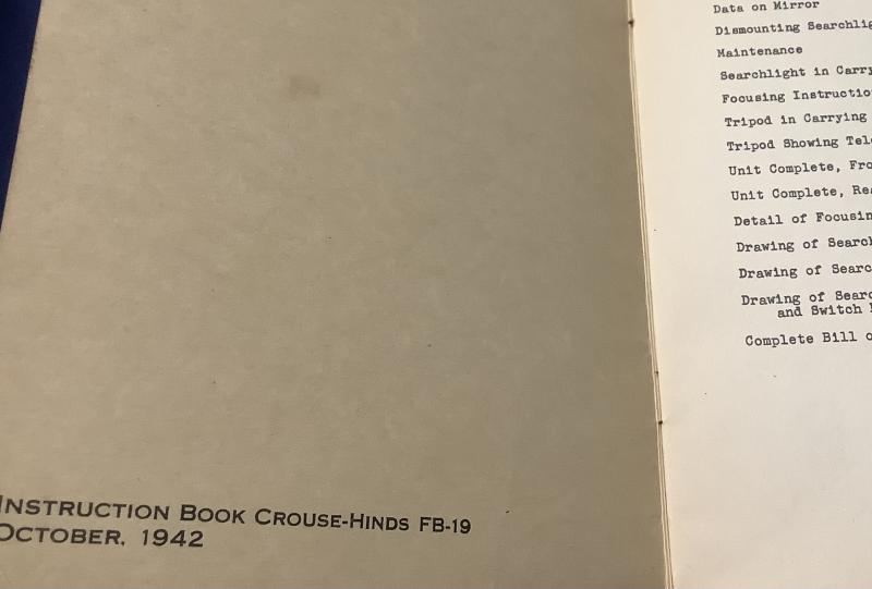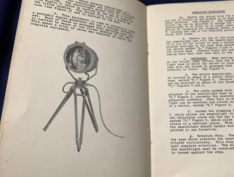 War Dept Booklet 18-Inch Portable Searchlight Model DCR-18. Minor wear to front and back covers, spotting, staining. All pages are intact no spotting.