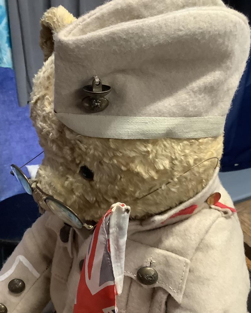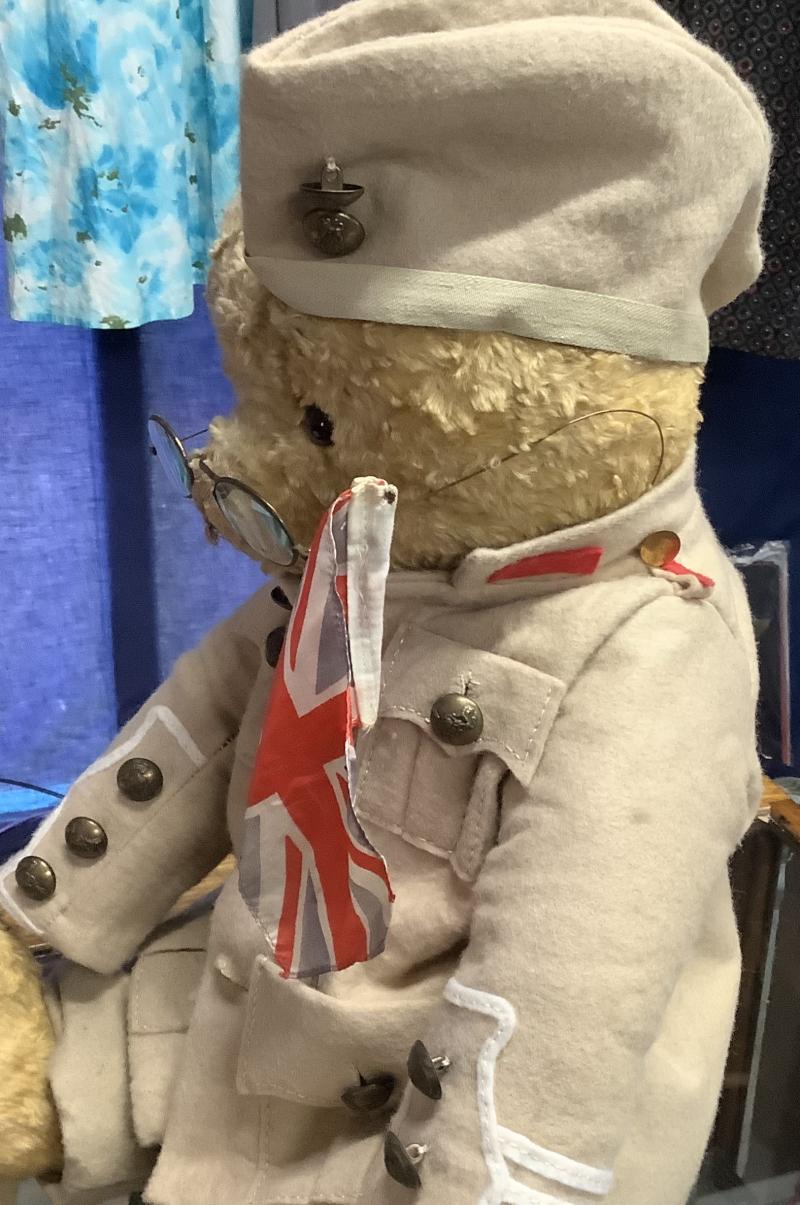 This Wonderful Wartime Bear needs some Love. He stands at 25 Inches in Height, has smart Uniform and Cap, 1940,s spectacles waving his Original Union Jack Flag. Glass eyes, Stitched nose, fully jointed. Very good condition.