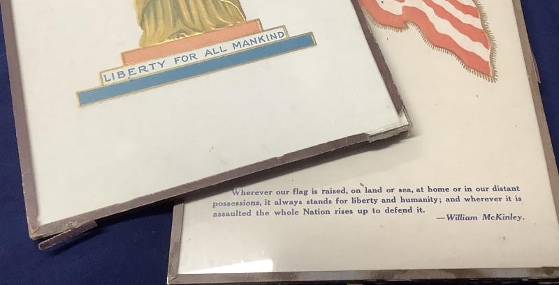 2 Patriotic Picture Frames from USA. Dated 1919. Glass, Board and Metal Pair. Statue of Liberty and United States Flag. Frames have minor wear due to storage but for their age good condition.
