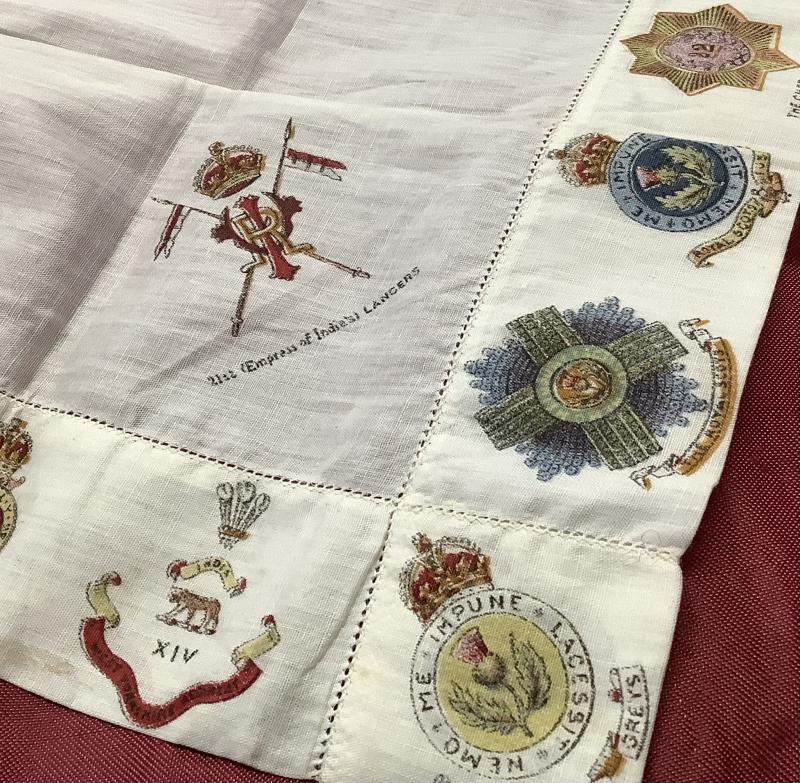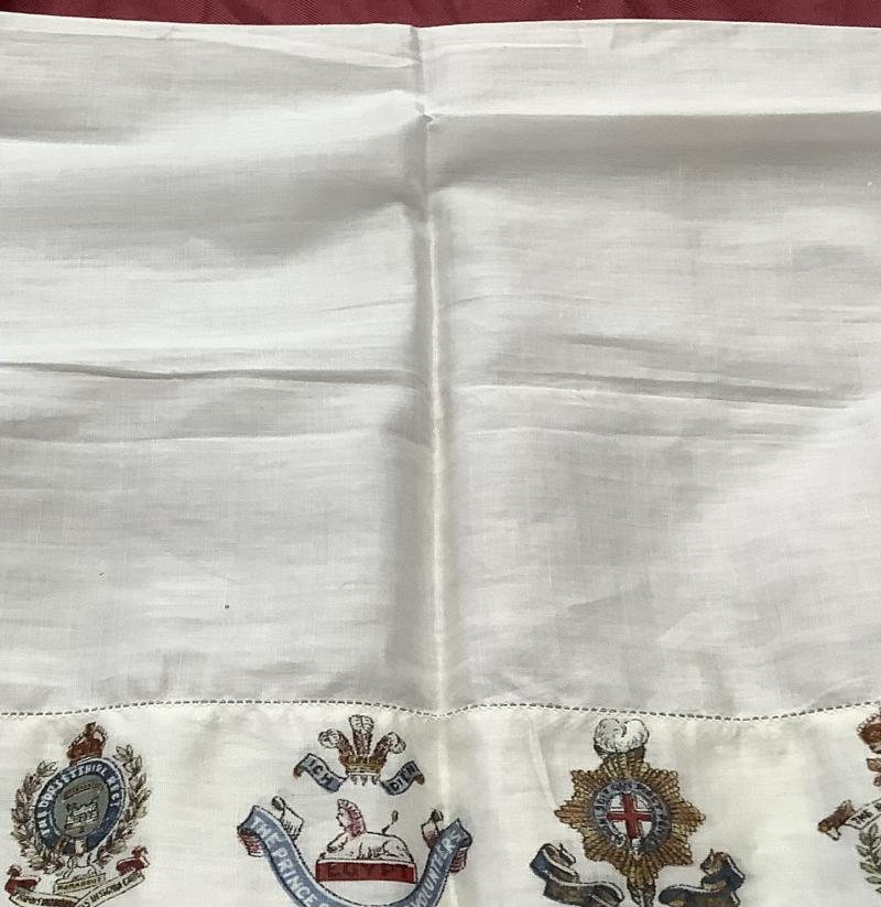 Great Silk with Border surrounded by Regimental Cap Badges. Very good condition, no stains.
