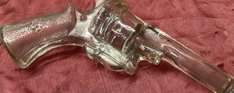 Glass Candy Holder in shape of Gun/ Revolver. This was a Variation of Candy Dishes/Holders made in various shapes, from Tanks, Jeeps, Caps. Very good condition. Unusual to find in this condition. Large size.