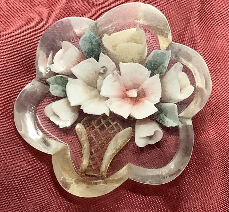 Sweetheart Brooch floral pattern in Lucite. Working clasp.