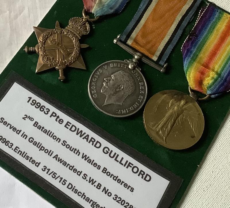 Awarded to 19963 Pte EDWARD.GULLIFORD. 2nd .Batallion. South Wales Borderers. Served in Gallipoli Awarded SWB No 3202863.