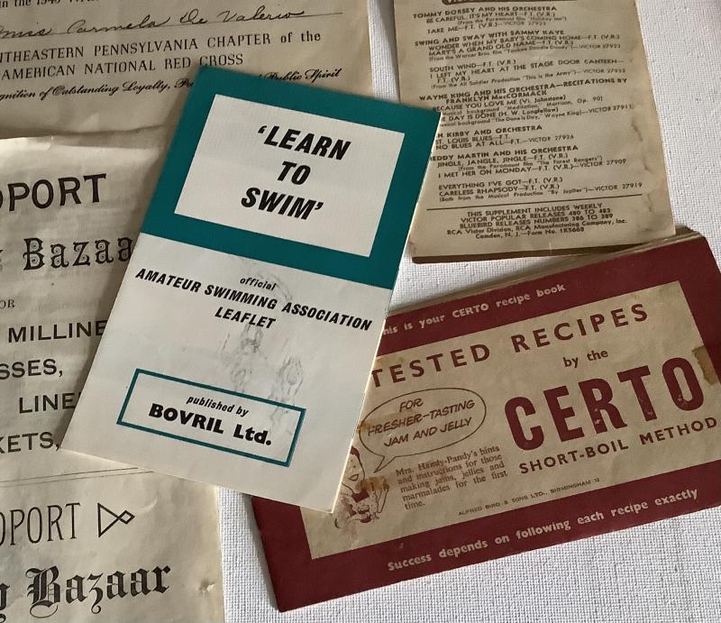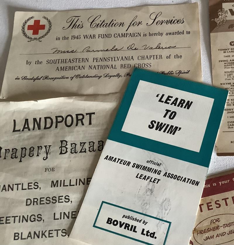 Red Cross War Fund Campaign. Cookery booklet by CERTO Jams & Jellies.Drapery, Bazaar Leaflet, Swim leaflet by Bovril, 1942 Victor records. Overall good condition. Signs of wear to CERTO booklet. Always combine postage.