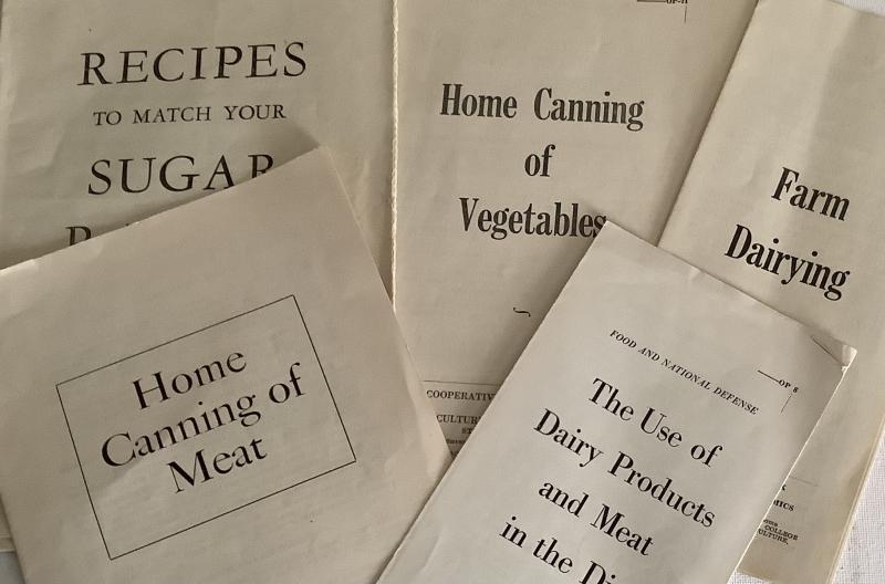 1938-41 Dated Ephemera. Farming, Use of Dairy, Canning of Meat, Vegetables and Sugar Ration. All in good fair condition from USA. Creasing in sugar ration booklet. No stains.