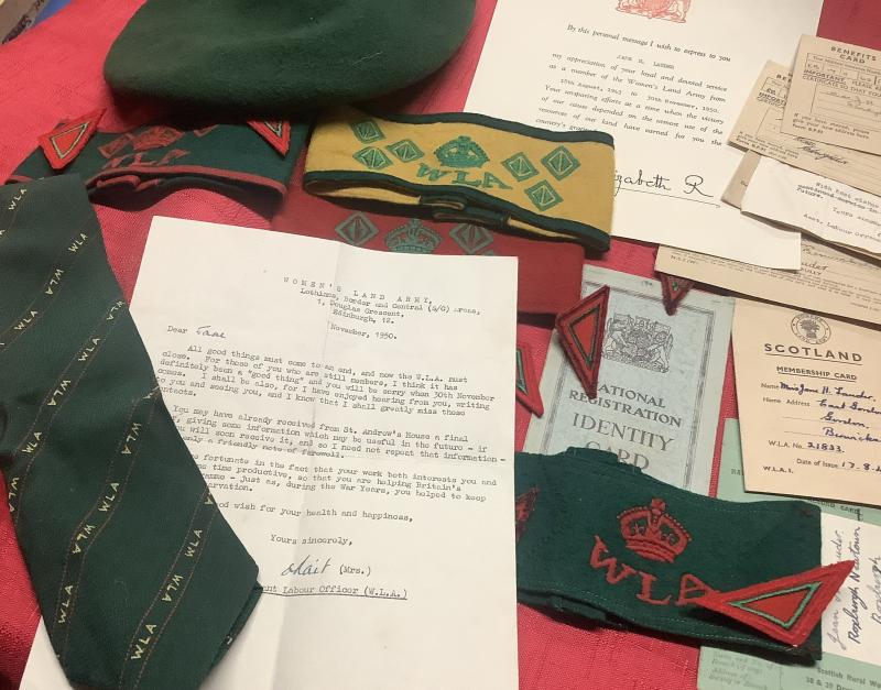 Original Ladies Land Army Grouping Named to Miss Jane Lauder who served in the W.L.A. from 1942 to 1950 includes all her long service arm bands, original Tie (no moth) 1948 dated Beret, all original ephemera. ID, membership card, several pieces relating to her service.